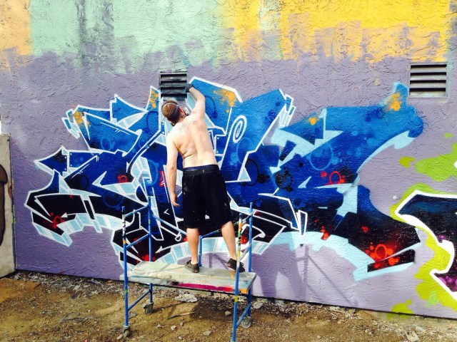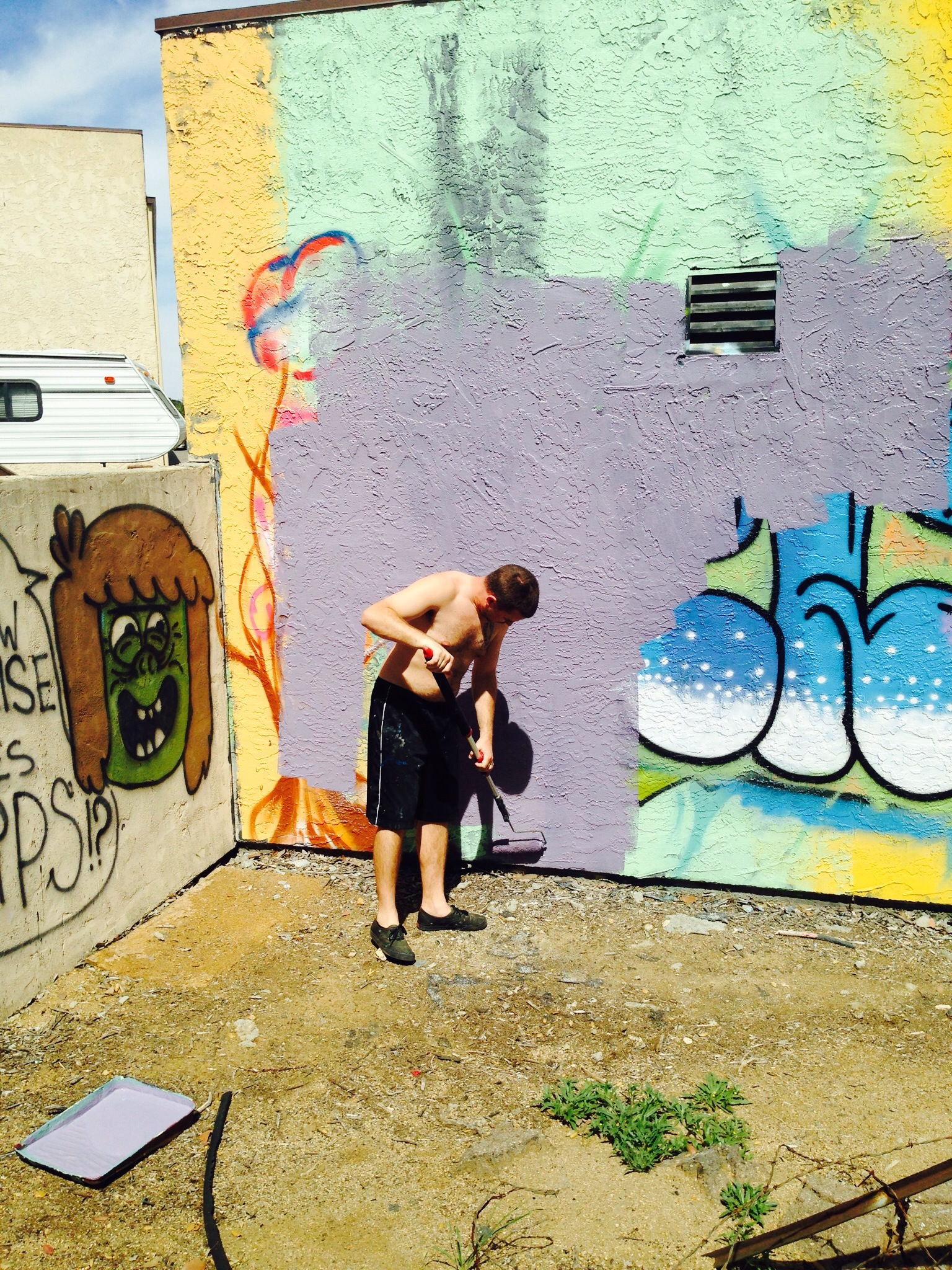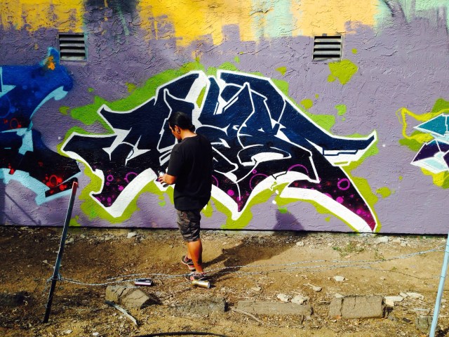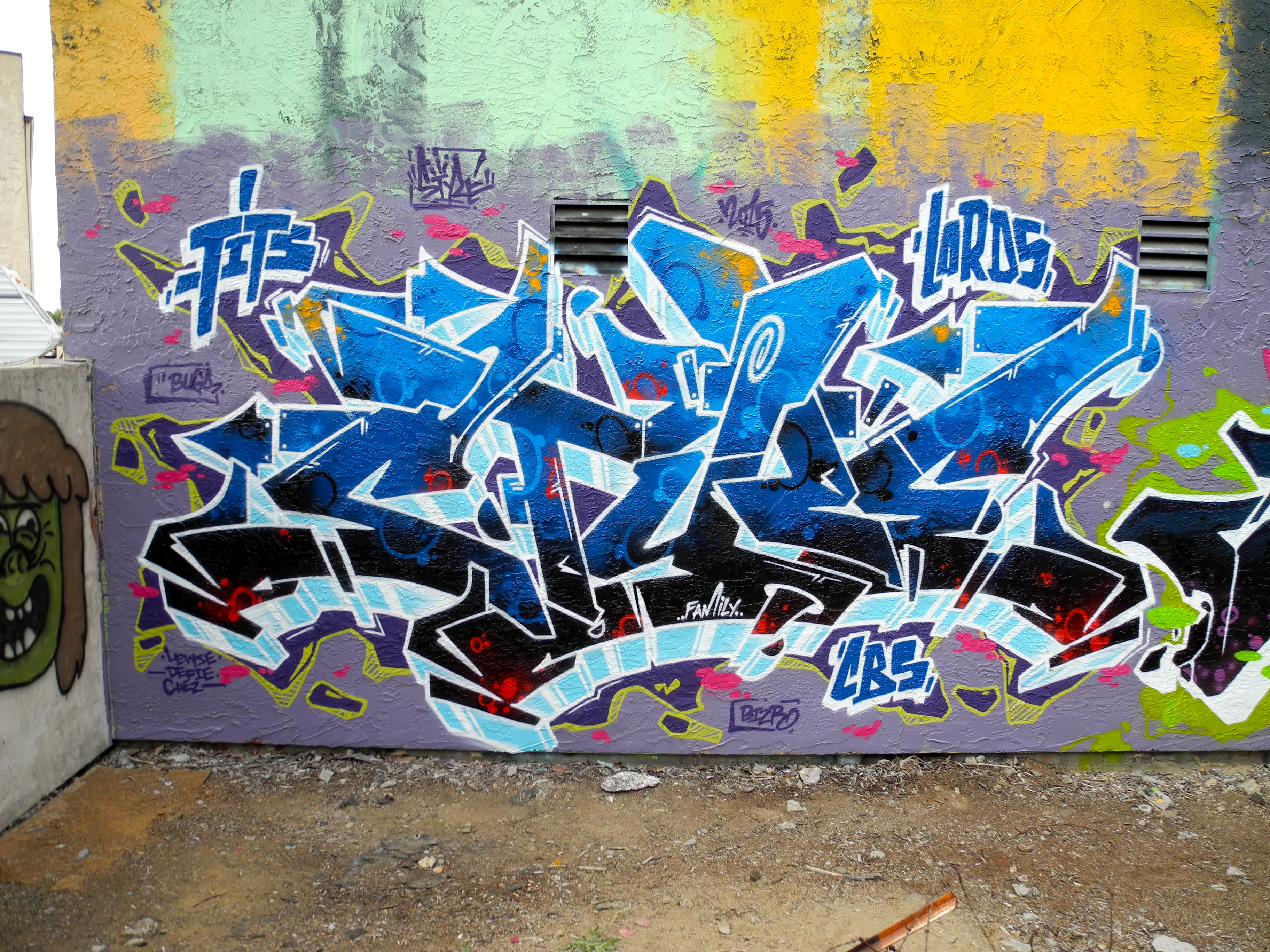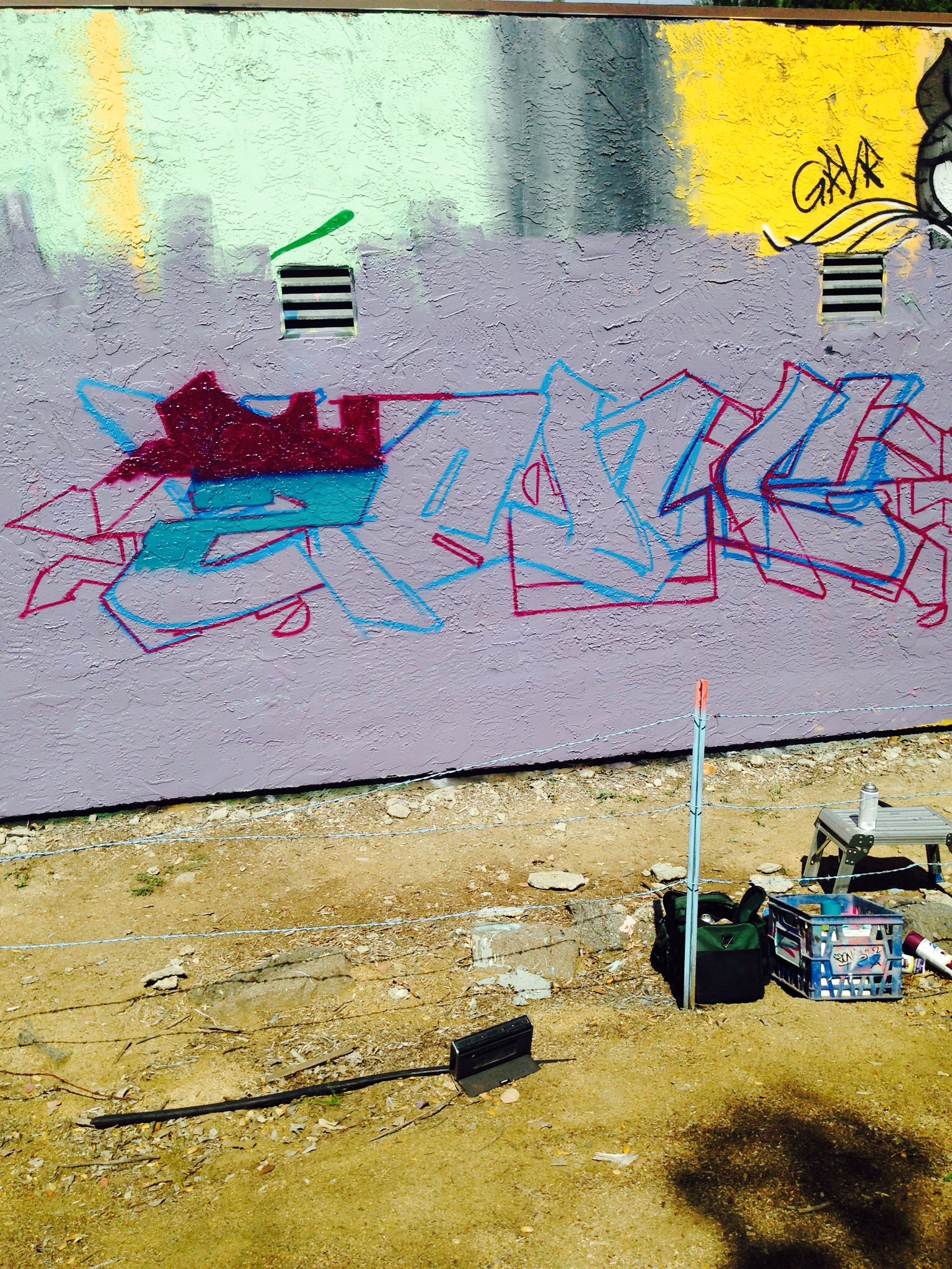 This was a dope session. I painted in the stink yard in the morning and met up with these cats at noon to paint up this spot which seems to have been overrun with toys as of late. We rolled out as much buff as wee could before running out and rocked our pieces. I tried out the new Rustoleum light turquoise, and was loving it. I used it in the 3D of my piece and the BBoy’s shirt and hat.