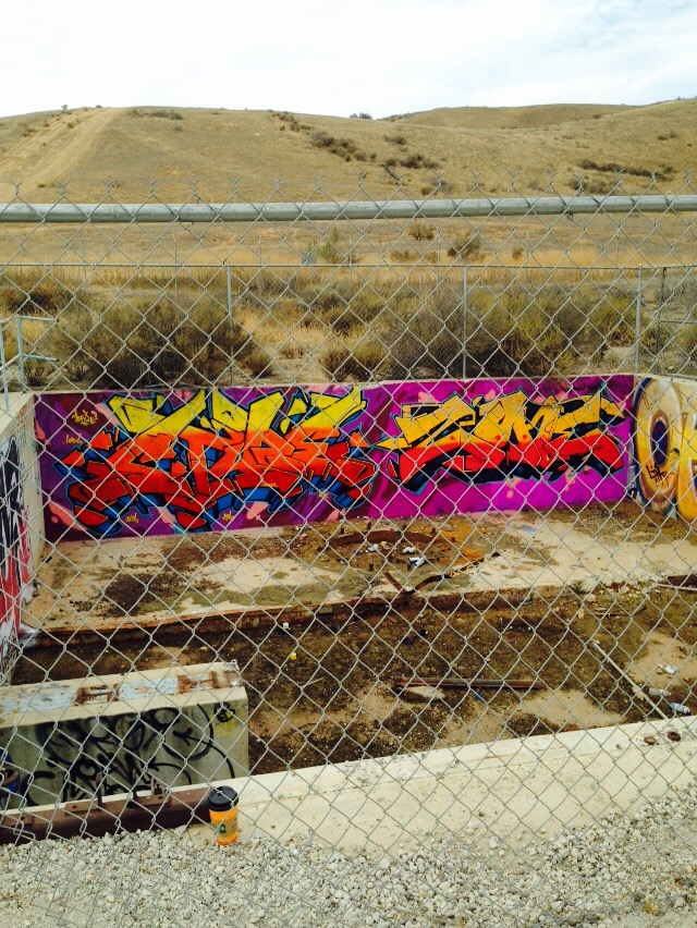 Here’s a quick session from Style and I. I was able to put some of my newly acquired Evolve Paint to use on some thirsty raw concrete here. Colors still came out as bright as ever. We didn’t want to be hanging around here for too long so we did our thing and bounced. I like the contrast of the pieces against dull tan and brown landscape here. Keep your eye out for my review on the new formula Evolve paint. Peace… until next time.